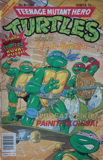 Sarjakuvahylly. Turtlesin numero 2/91. Jostain syystä minulle ei ostettu tuota irtonumeroa tuolloin. Kun se luvattiin haettavaksi, oli lehti jo myynyt loppuun. Sain sen sijaan uuden